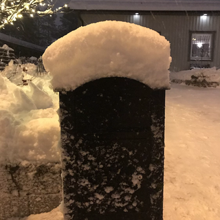 Skottat en gång till före läggdags. Tung snö nu för tyvärr har det blivit varmare ute. Och traktorn kom äntligen så vi kunde skotta bort vallen innan natten. Nu väntar vi med spänning på hur mycket snö det kommit i morgon bitti. Det blåser kraftigt, kan bli drivbildning.